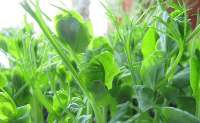 Ruccola, Grönkål i förgrunden, Ärtskott och majsskott i bakgrunden.